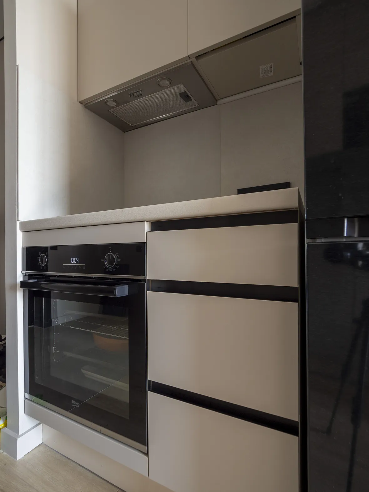 Техника: мойка и смеситель - EMAR, измельчитель - BONE CRUSHER, встроенный духовой шкаф, встроенная электрическая варочная панель, встроенная СВЧ, встроенная вытяжка, встроенная ПММ, встроенный холодильник - KORTING